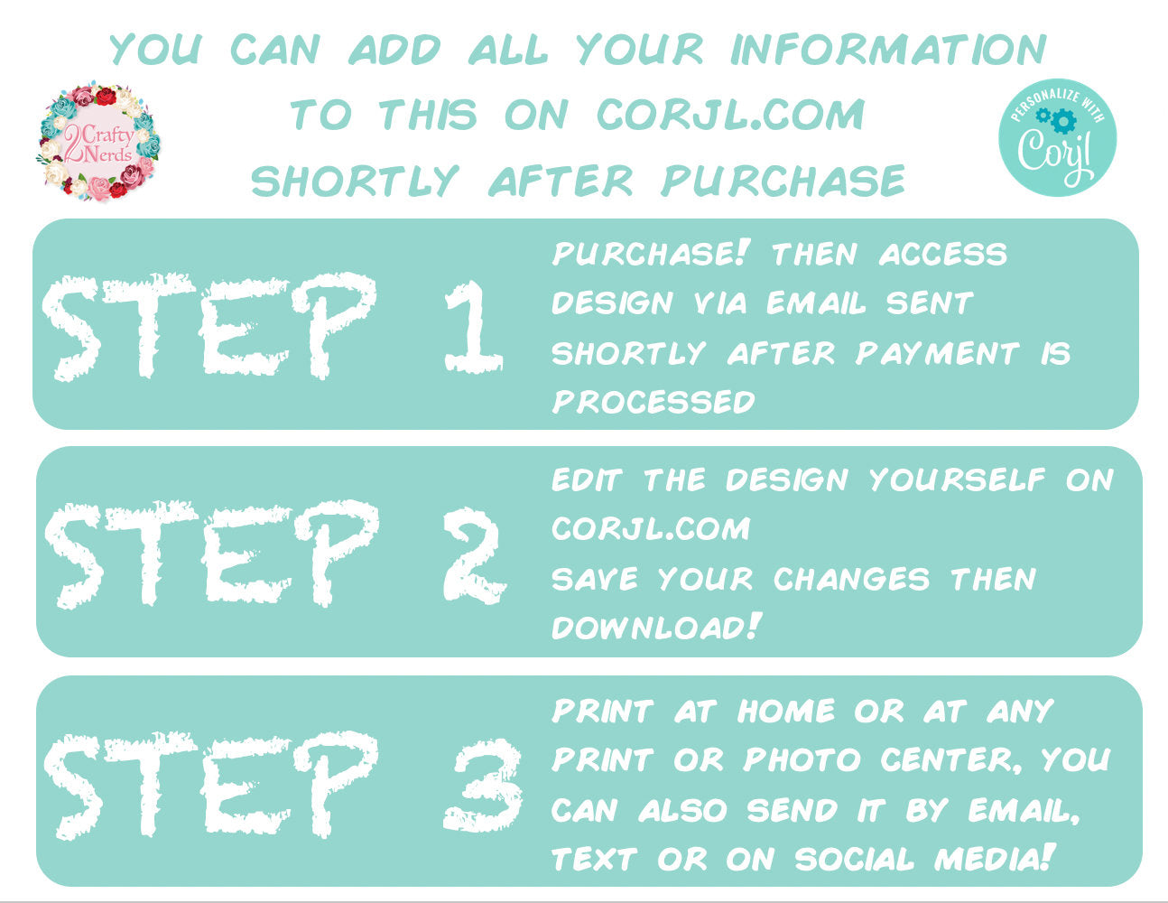 This can be printed as a photo at a photo lab, like Walmart, Walgreens, Costco, Sam’s Club, etc. ( as a .JPG). it can also be printed on white cardstock at home or a print shop, like Staples, UPS, Office Depot or FedEX (as a PDF ). If you want to email or post on any social media it’s best to use a JPG.