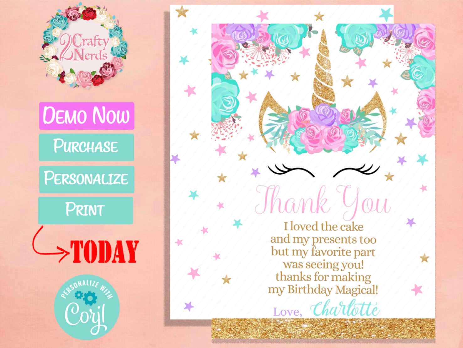 Unicorn Birthday Thank You Card Pastel Pink Turquoise Lavender Purple | Editable Instant Download | Edit Online NOW Corjl | INSTANT ACCESS
